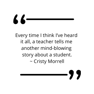 “Every time I think I’ve heard it all, a teacher tells me another mind-blowing story about a student,” Cristy Morrell, says. “If our kids need food or clothing, we find the resources to help them. Our teachers go above and beyond for their families.”