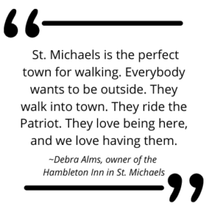 And why not? “St. Michaels is the perfect town for walking,” Alms says. “Everybody wants to be outside. They walk into town. They ride the Patriot. They love being here, and we love having them.”