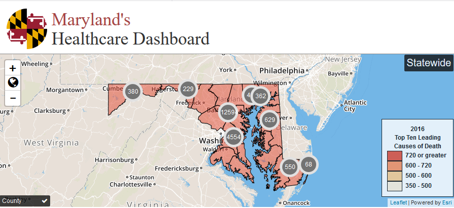 The Eastern Shore Regional GIS Cooperative in partnership with the Mid-Shore Regional Council and the Tri-County Council for the Lower Eastern Shore of Maryland has recently released a new interactive dashboard focused on healthcare in Maryland. The Healthcare Dashboard provides Maryland’s decision-makers with information on the health care industry and prominent health conditions in Maryland. It utilizes data from the Center for Disease Control and Prevention, ESRI Demographic and Business database, and ESRI Consumer Spending database. Users can analyze data both spatially and temporally as well as filter data by primary cause of death, provider type, or spending category.