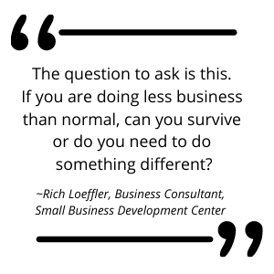 Rich Loeffler, business consultant for the Small Business Development Center, has some advice for navigating through these unsettling times. He suggest these three action items: 1) evaluate where your business is now, 2) take care of your employees, and 3) work closely with your lender.