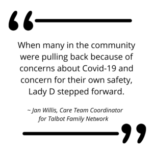 Jan Willis, local care team coordinator for Talbot Family Network who manages the food group for the Talbot County Emergency Operations Center, nominated Thomas. “Before COVID-19, organizing an event of this size was a huge undertaking,” Willis says. “But during the pandemic it became significantly more difficult. Lady D did not shy away from the challenge or the threat of COVID.”